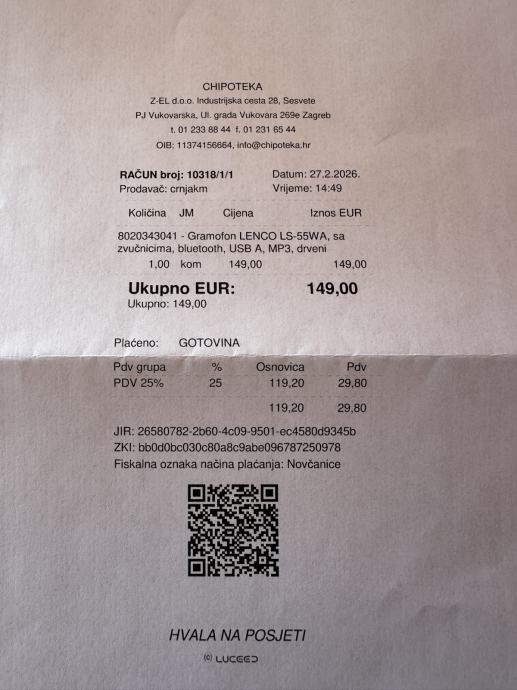 Gramofon kupljen u Chipoteci, malo korišten, u originalnoj kutiji! Gramofon ima ugrađene zvučnike za reprodukciju, kao i line-out izlaze za pojačala. Prodaje se gotovo u pola cijene!