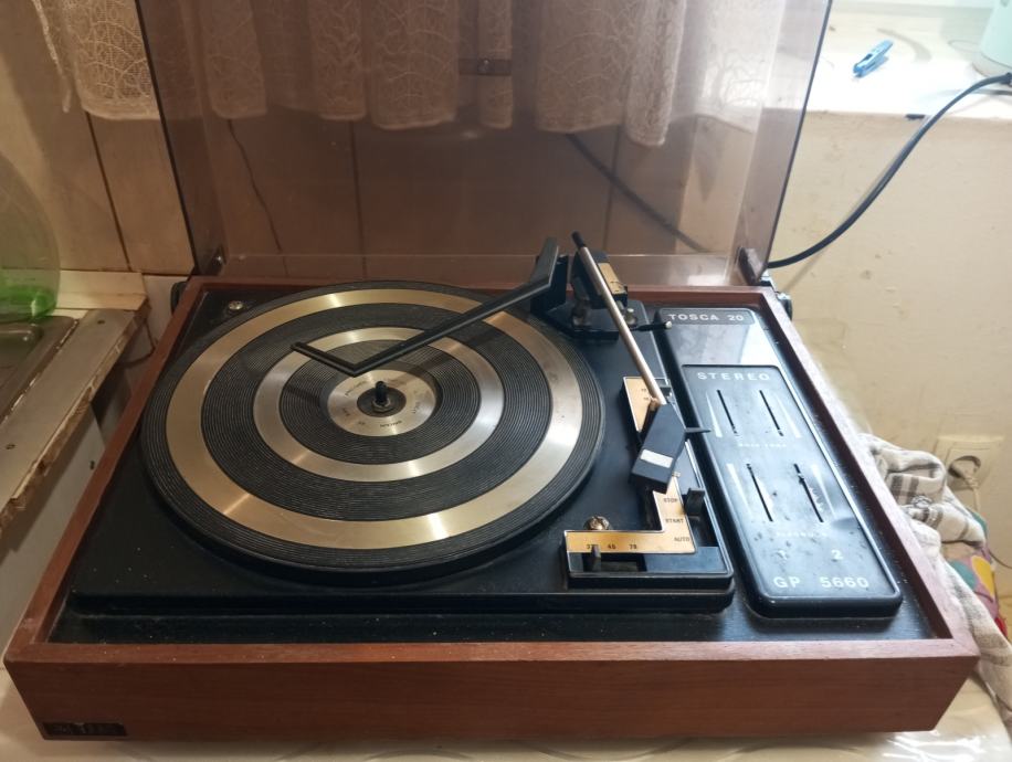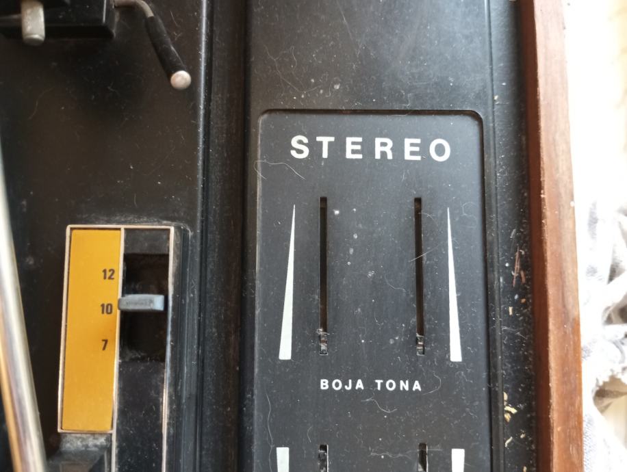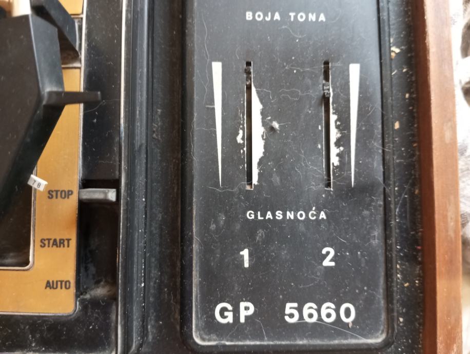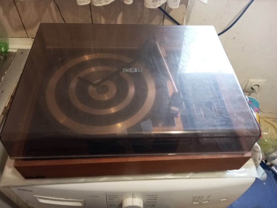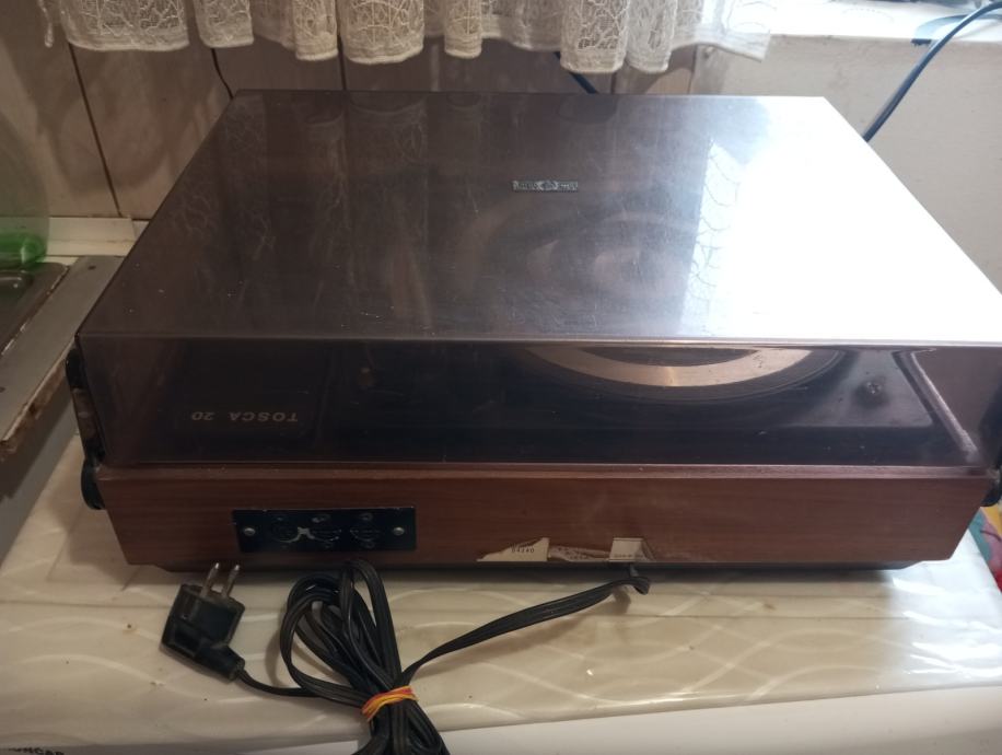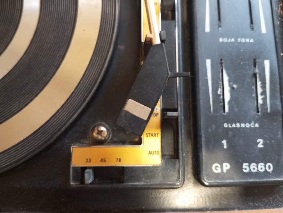 Gramofon bez zvucnika. Može se pokrenut uz dosta truda. Prodaje se pod neispravan za restauraciju ili djelove. Kad se pokrene iz njega se cuje zvuk. Ima oštećenja na poklopcu u kutu sto sam slikao i na tipkama za pojačati i smanjiti. Igla je zamjenjena i nova.