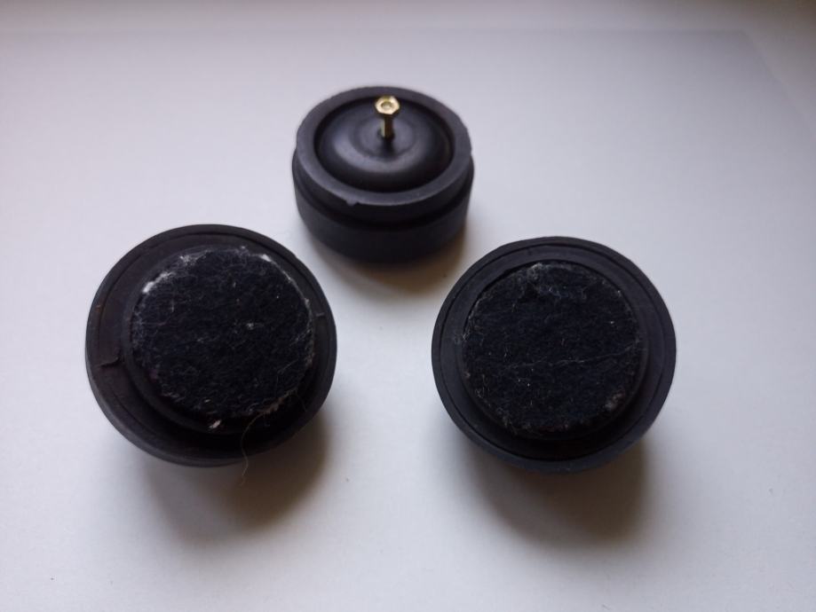 Prodajem nekoliko podložaka skinutih sa podnica raznih gramofona, raznih veličina, kvaliteta, količina, stanja i cijena. Dakle, cijena po komadu nije fiksno 30 kuna, a u ponudi imam npr. komplete od 4 podloška skinutih sa gramofona koji teže 3 kg, za koje ukupno tražim 7 €, kao i npr. podloške za gramofone mase 5-7 kg, koje ukupno cijenim 10 €. Nemam podloške za audiofilske gramofone, imam samo za one za običan narod.