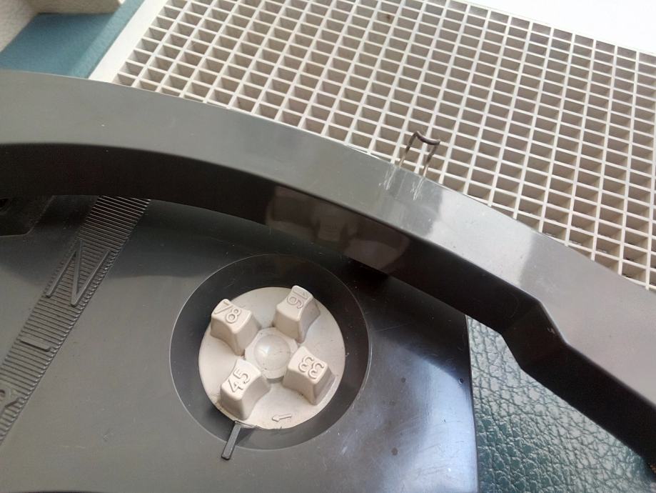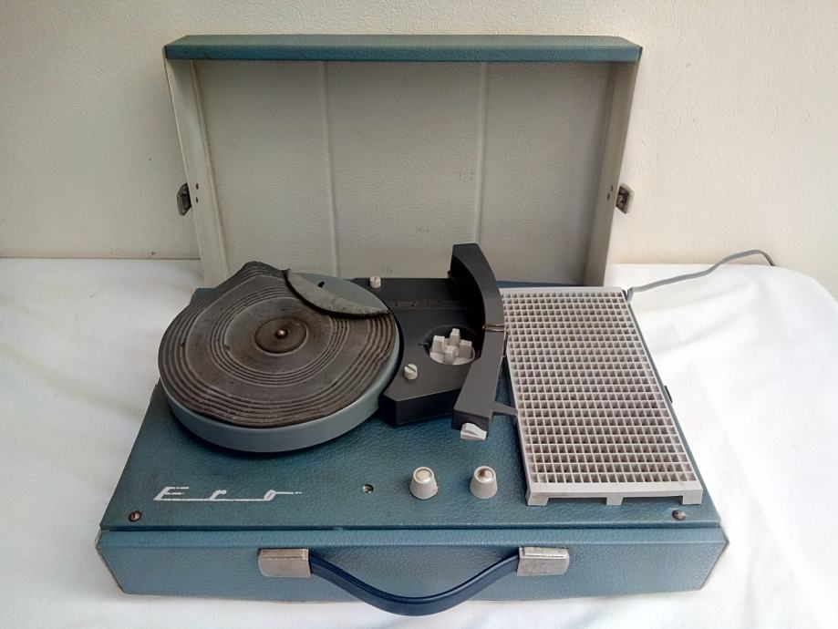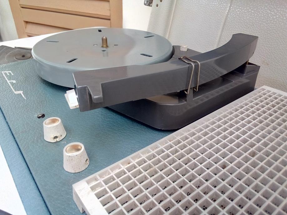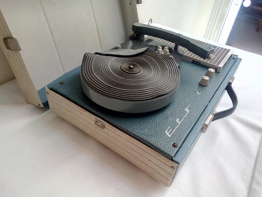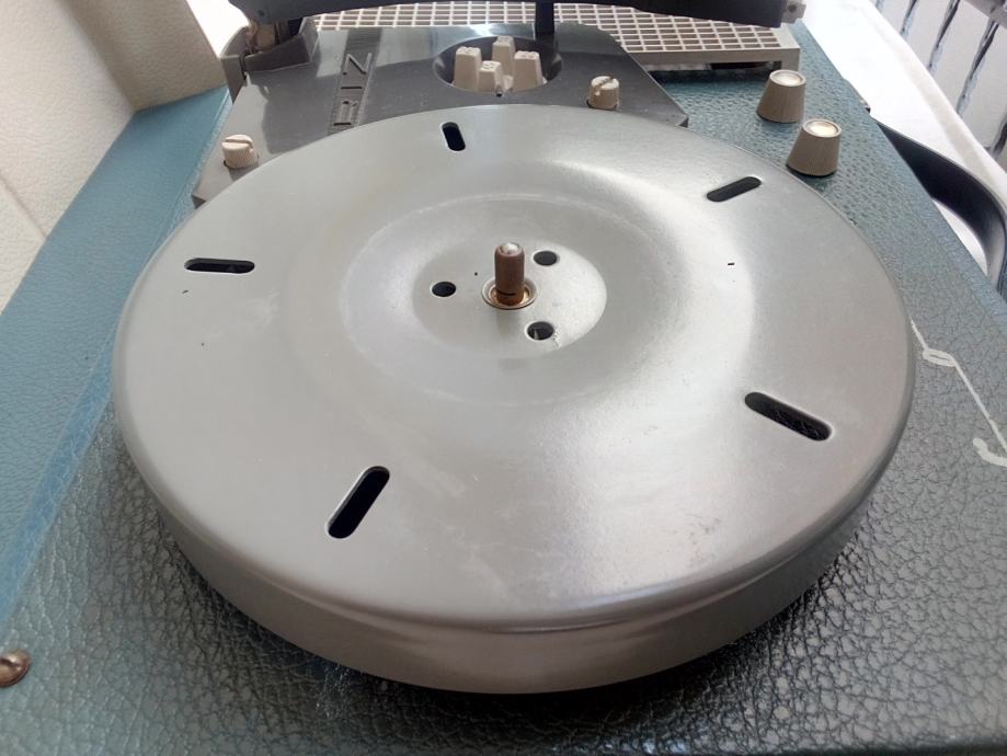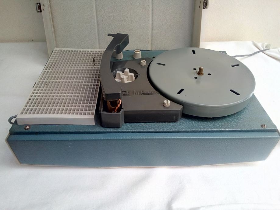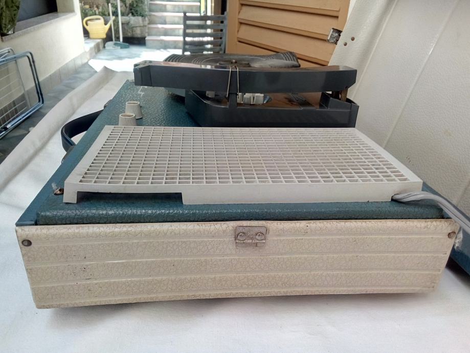 Ne radi, jer mu je vrlo vjerojatno pregorio mrežni kondenzator, a to mislim jer sam ga htio provjeriti, radio je par minuta, dok se nije ukazao dim iz njega, uz tihi zvuk pucketanja. Zato nisam stigao ništa drugo provjerit na njemu. Zvučnica je dvostrana, marke Ronnette, a fali jedna igla. Tarenica (idler wheel) je čitava, bez pukotina, ali kruta i vrlo vjerojatno lomljiva.