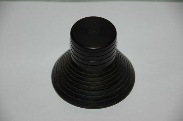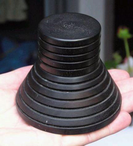 LP Record Clamp - A legendary Shun Mook product now begin made in a very, very limited number. This record clamp is made from extremely rate pieces of dried ebony briar. This extra heavy century old ebony root which were immersed in the swamps of Africa has a unique power that no other wood possesses. The vibration generated by the diamond style in the vinyl groove besides inducing an electroflux through the phono-cartridge also excites the ebony molecules, causing it to resonate. This in turn is feed back through the styles, causing it to resonate. This in turn is feed back through the stylus and is reparation, sharpened focus and enriched tonal balance of the music. Due to the rareness of this timber, there is no doubt that it will become a collector item in the future.