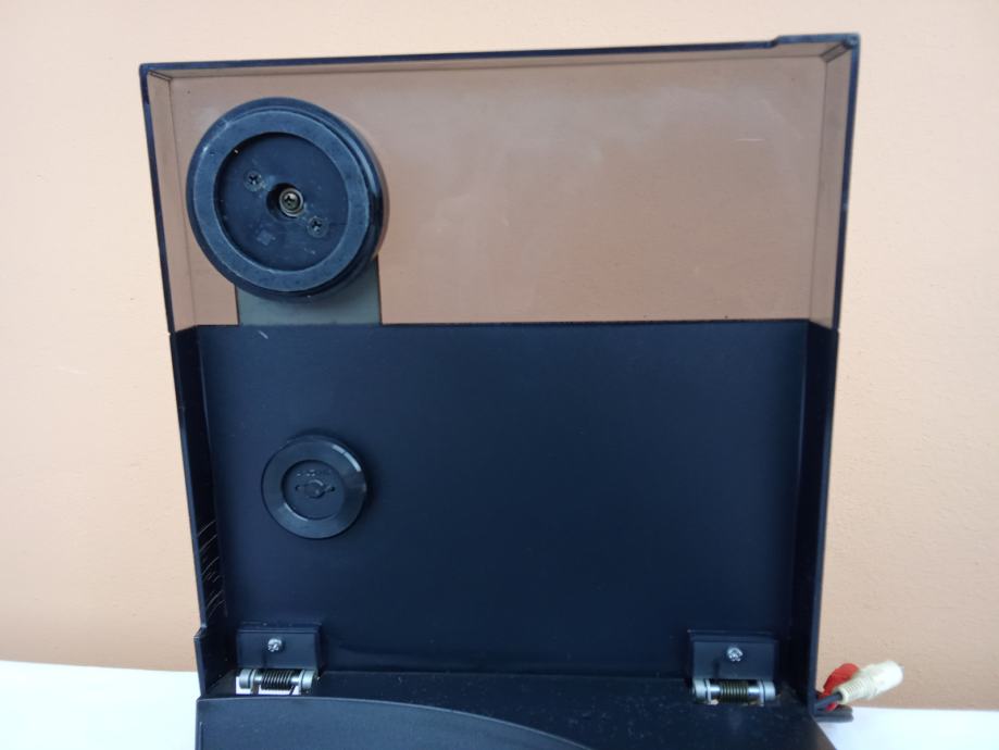Nedostaju zvučnica, igla, oba remena i kuka koja ručku drži pričvršćenom za oslonac. Kada stisnem tipku "start/stop", samo se čuje neko zujanje iz predjela gdje je ležaj ručke, koji podsjeća na zvuk nekog motorića, a motor koji bi trebao pokretati vrtnju "tanjura" se ne pokrene, iako on radi kada ga izravno spojim na struju. Fotografije priložene uz oglas prikazuju ovdje oglašeni uređaj. Cijena je fiksna.