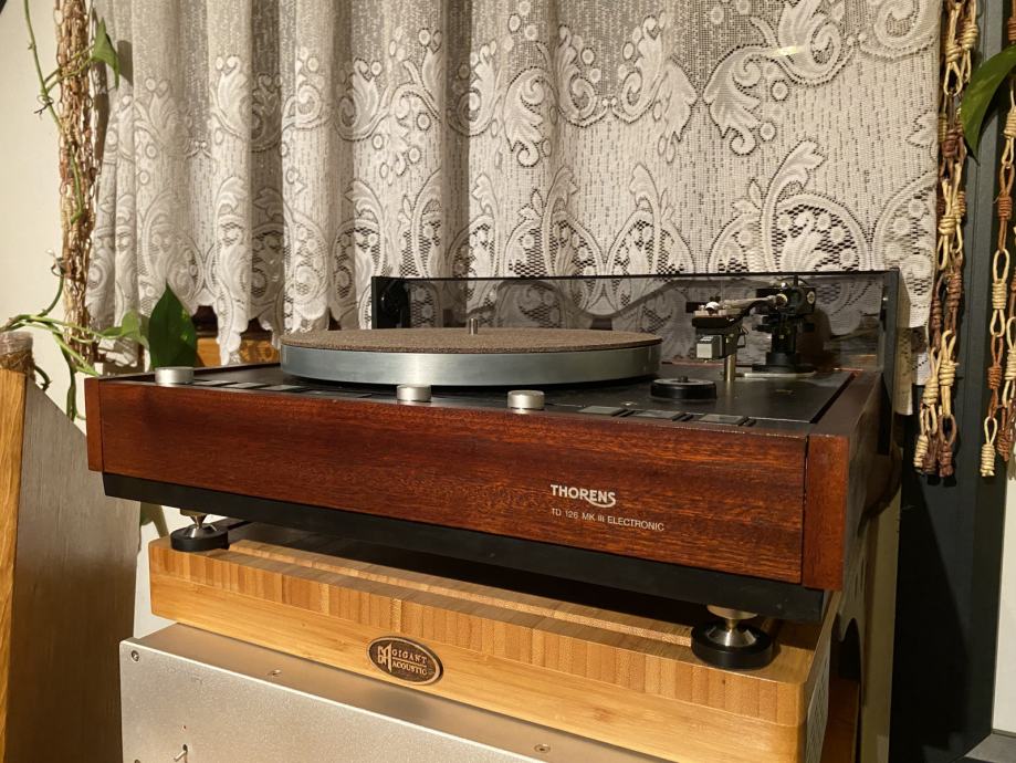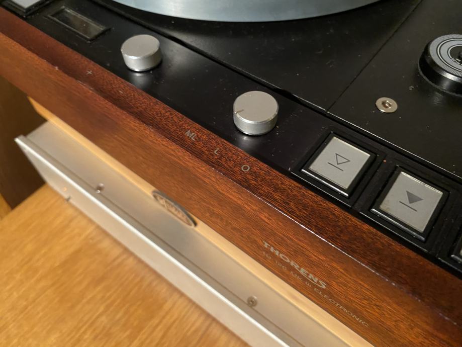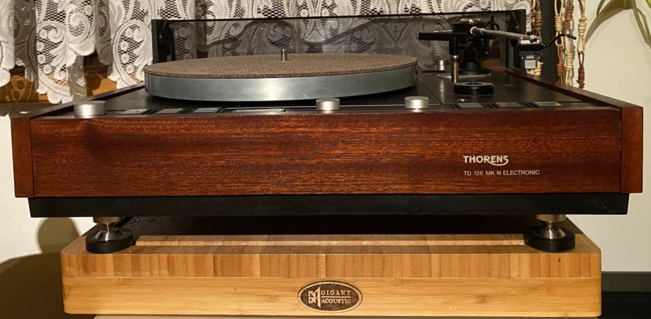 Po mnogima najbolji Thorensov gramofon TD 126 Mk3 electronic s izvrsnom 10” japanskom ruckom Jelco TP250 ST s cijevi od titanijum nitrida, potpuno restauriran i podesen, visokokvalitetne antivibracijske nogice, guma-pluto mat, RCA i GND konektori na kucistu, zamijenjeni svi elektrolitski kondenzatori u elektronici motora, novi remeni, ozicenje rucke Laurin Phono Reference, dampirana podnica. Finis gramofona je mahagonij, vro rijedak (isporucivao se uz doplatu)