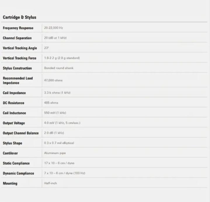 Vertikalni kut praćenja je 23°, a preporučena sila praćenja kreće se između 1,8 i 2,2 g (standardno 2,0 g). Zavojnička impedancija iznosi 3,3 k ohma pri 1 kHz, a DC otpor je 485 ohma. Induktivitet zavojnice je 550 mH pri 1 kHz, a balans izlaznih kanala 2,0 dB pri 1 kHz.