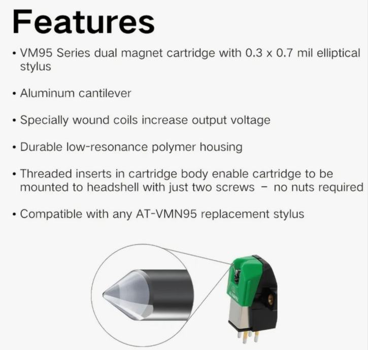 Radi se o eliptičnoj iglici dimenzija 0,3 x 0,7 mil, postavljenoj na aluminijski kantilever s bonded round shank konstrukcijom. Frekvencijski odziv iznosi 20–22.000 Hz, a razdvajanje kanala je 20 dB pri 1 kHz. Izlazni napon je 4,0 mV (1 kHz, 5 cm/sek.), a preporučena impedancija opterećenja je 47.000 ohma.