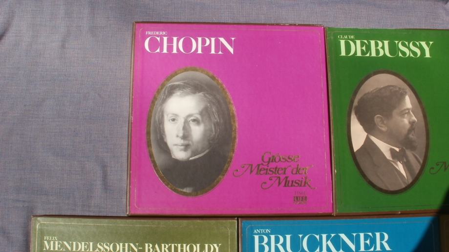 GROSSE MEISTER DER MUSIK - FREDERIC CHOPIN. GROSSE MEISTER DER MUSIK CLAUDE DEBUSSY. GROSSE MEISTER DER MUSIK - FELIX MENDELSSOHN-BARTHOLDY. GROSSE MEISTER DER MUSIK - ANTON DVORAK. GROSSE MEISTER DER MUSIK - ANTON BRUCKNER. TO SU LUKSUZNA IZDANJA U KUTIJAMA POD NAZIVOM GROSSE MEISTER DER MUSIK - TIME LIFE MUSIK. SVIH 5 KUTIJA ZA 100 EURA. U SVAKOJ KUTIJI JE OD 3-4 PLOČE. 098/169-9995.