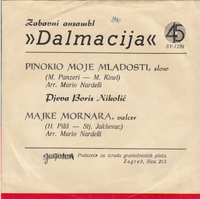 ANSAMBL DALMACIJA PINOKIO MOJE MLADOSTI SINGL GRAMOFONSKA PLOČA