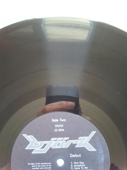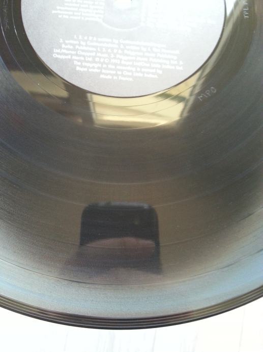 Ploča vizualno: Labeli su jako čisti i uredni, bez ikakvih tragova spindle weara, te izgledaju kao novi. Ploča ima sjaj nove i djeluje čisto i uredno bez nekih dubljih friževa. Tek temeljitim pregledom sam uočio da ploča na svakoj strani ima po jedan jedva vidljiv površinski frižić (13) i nešto onih crtica koje se u uvjetima normalne osvijetljenosti ni ne vide već samo kao refleksija na direktnom svjetlu. Vizualno ploča izgleda Vg+ očuvana.
