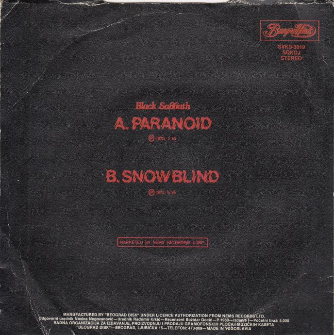 BLACK SABBATH PARANOID / SNOWBLIND SINGL GRAMOFONSKA PLOČA