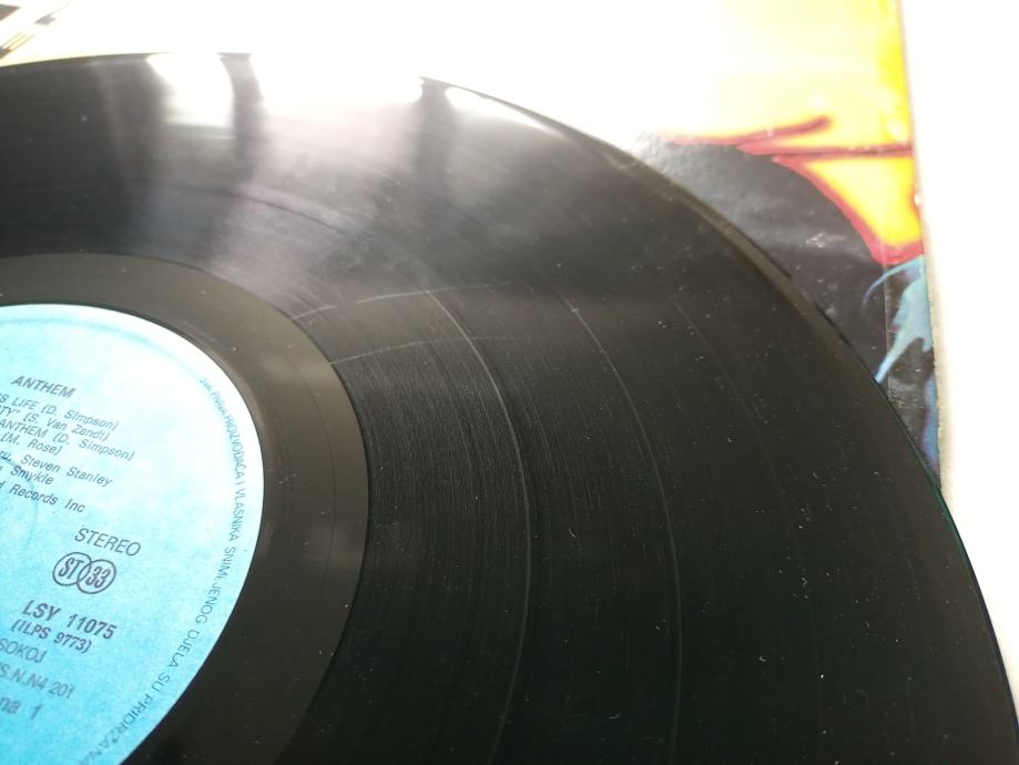 Pogledajte priloženi YouTube video, koji sadrži fotografije oglašenog primjerka i autentičnu snimku zvuka s početka prve strane, napravljenu amaterskom opremom. Glazbeni sadržaj ploče je u potpunosti poslušan, ona svira bez preskoka igle, uz kvalitetu zvuka kao što je ta u snimci. Na njoj nema dubokih i jako ružnih ogrebotina, u vlastitoj sjeni izgleda kao nova, ali postoje mnoge plitke ogrebotine koje su nastale trenjem ploče uz finu prašinu u omotu, vidljive samo pod nekim kutom promatranja. Oštećenja brazdi su mjestimično vidljiva, a uzrokuju stalno vrlo tiho pucketanje i jedva primjetnu distorziju zvuka. Donji rub omota je probijen u duljini 5 cm, a hrbat je samo površinski oštećen. Ostalo o stanju oglašenog predmeta govore fotografije priložene uz oglas i već spomenuti video.