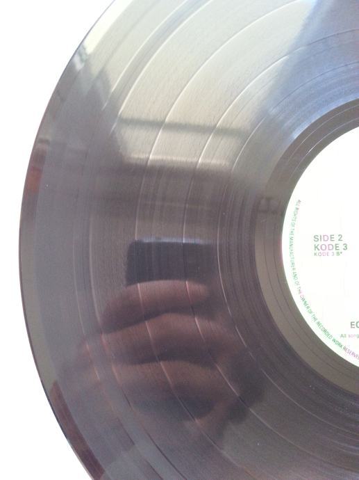 Ploča vizualno: Labeli su jako čisti i uredni, bez ikakvih tragova spindle weara i izgledaju kao novi.. Ploča ima sjaj nove i djeluje jako čisto i uredno bez ikakvih dubljih friževa. Tek temeljitim pregledom na jakom svjetlu sam uočio jedan jedva vidljiv površinski frižić na A strani (slika 12) koji se ne može opipati pod prstom te ne utječe na samu reprodukciju i nešto onih najsitnijih crtica nastalih od vađenja iz papirnatog innera koje se u uvjetima normalne osvijetljenosti ni ne vide već samo kao refleksije na direktnom svjetlu. Vizualno ploča izgleda Ex očuvana.