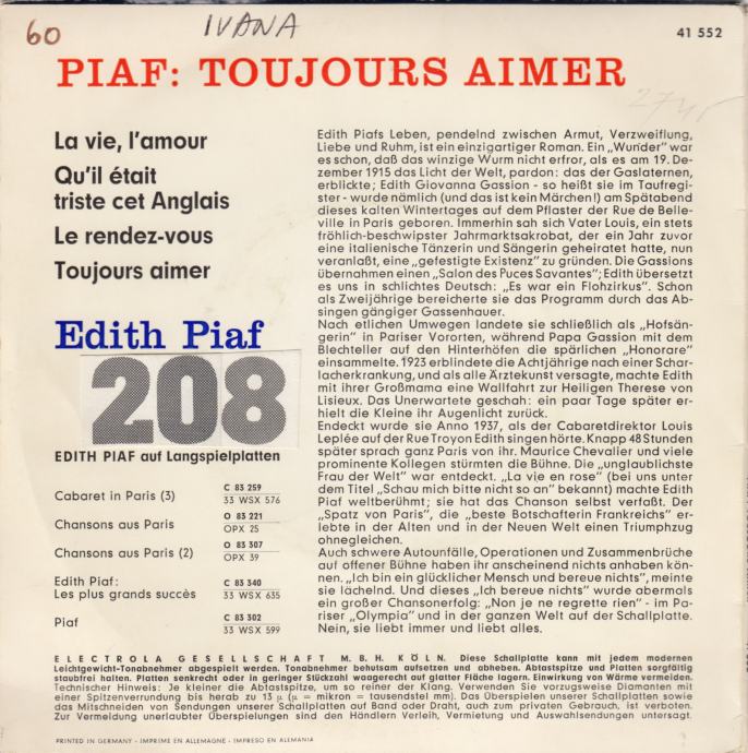 EDITH PIAF LA VIE L'AMOUR / LE RENDEZ-VOUS SP PLOČA