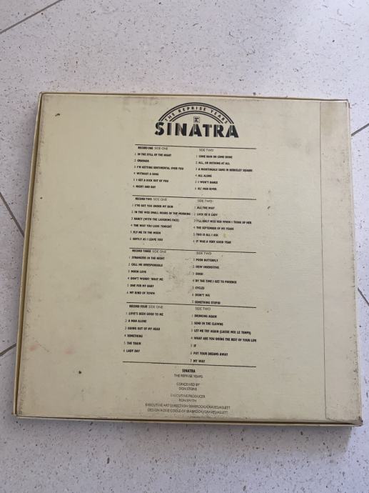 Frank Sinatra: "Sinatra, The Reprise Years" box set s četiri LP ploče. Box set, tiskan i proizveden u Engleskoj od strane Gothis Print Finishers Ltd., London SE9 2EQ. A Reprise Recording distribuira WEA Records Ltd, 1975. Reprise records, K94003. SINATRA --- THE REPRISE YEARS RECORD 1, strana 1 od 4 Ploče 1. In The Still Of The Night (iz "Ring A Ding Ding") 2. Granada (iz "Sinatra Swings") 3. I'm Getting Sentimental Over You (iz "I'm Getting Sentimental Over Tommy") 4. Without A Song (iz "I'm Getting Sentimental Over Tommy") 5. I Get A Kick Out Of You (iz "Sinatra & Swingin' Brass") 6. Night And Day (iz "Sinatra & Strings") Više naslova s originalnih albuma. Come Rain Or Come Shine, All Or Nothing At All, A Nightingale Sang In Berkeley Square, All Alone, I Won't Dance, Ol' Man River, I've Got You Under My Skin, In The Wee Small Hours Of The Morning, Nancy, The Way You Look Tonight, Fly Me To The Moon, Softly, As I Leave You, All The Way, Luck Be A Lady, I'll Only Miss Her When I Think Of Her, September Of My Years, This Is All I Ask, It Was A Very Good Year, Stranger In The Night, Call Me Irresponsible, Moon Love, Don't Worry 'Bout Me, One For My Baby, My Kind Of Town, Poor Butterfly, How Insensitive, Dindi, By The Time I Get To Phoenix, Cycles, Didn't We? Somethin' Stupid s Nancy Sinatrom, Love's Been Good To Me, A Man Alone, Going Out Of My Head, Something, The Train, Lady Day, Drinking Again, Send In The Clowns, Let Me Try Again, What Are You Doing The Rest Of Your Life, If, Put Your Dreams Away, My Way. Također uključuje 17 stranica brošure s komentarima o životu Franka Sinatre, uključujući fotografije.