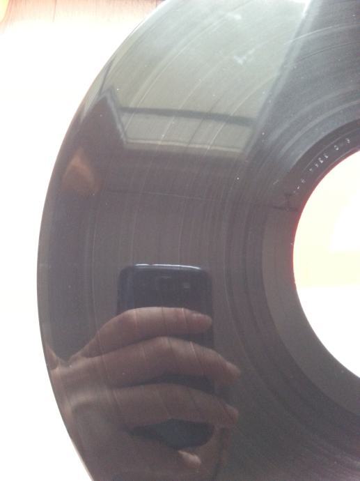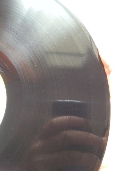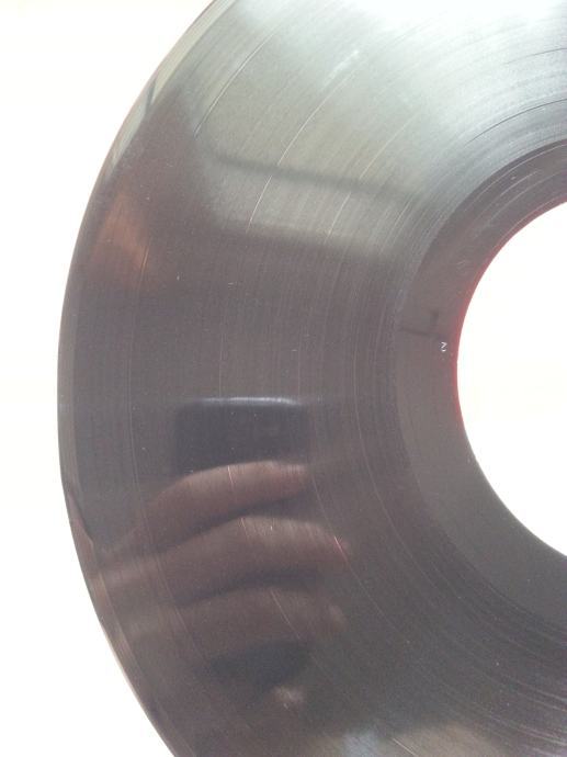 Ploča vizualno: Labeli su jako čisti i uredni, bez ikakvih tragova spindle weara i izgledaju kao novi. Ploča ima sjaj nove i djeluje čisto i uredno bez ikakvih dubljih friževa. Tek temeljitim pregledom sam uočio jedan jedva vidljiv frižić (slika 12) i nekoliko onih crtica koje se u uvjetima normalne osvijetljenosti ni ne vide već samo kao refleksija na direktnom svjetlu te ne utječu na samu reprodukciju. Vizualno ploča izgleda Nm očuvana.