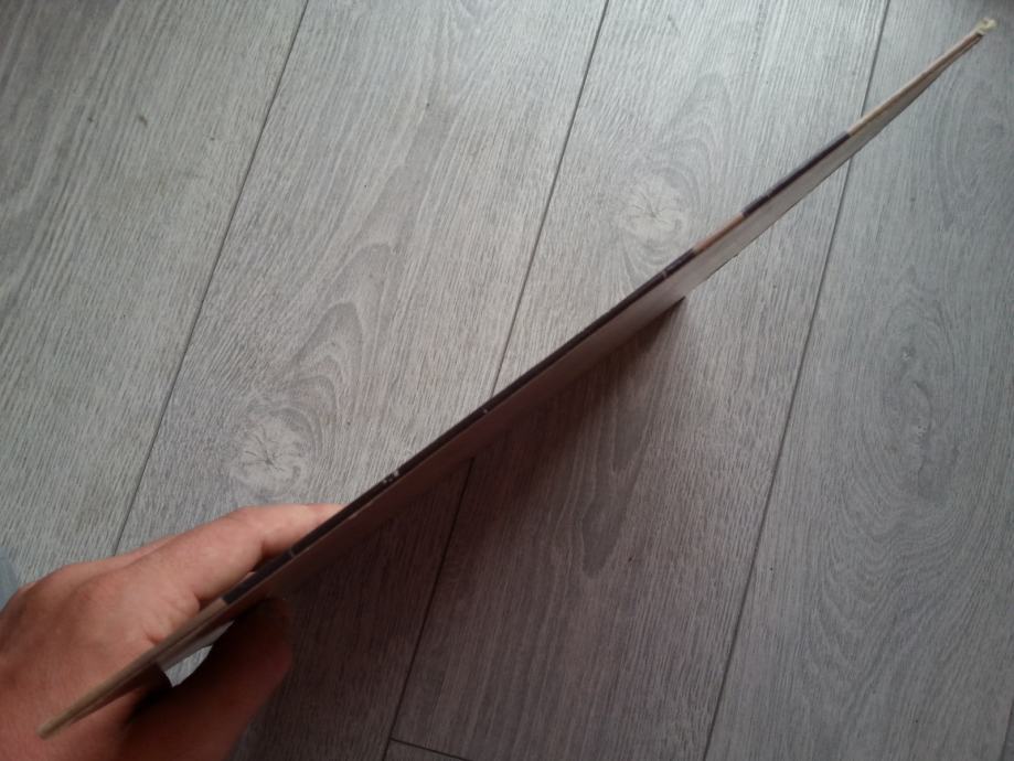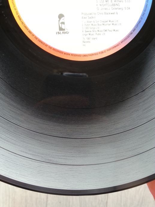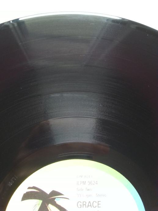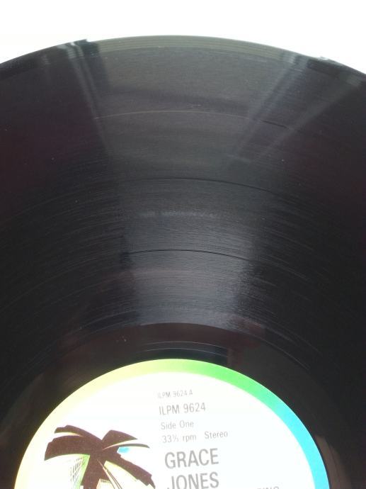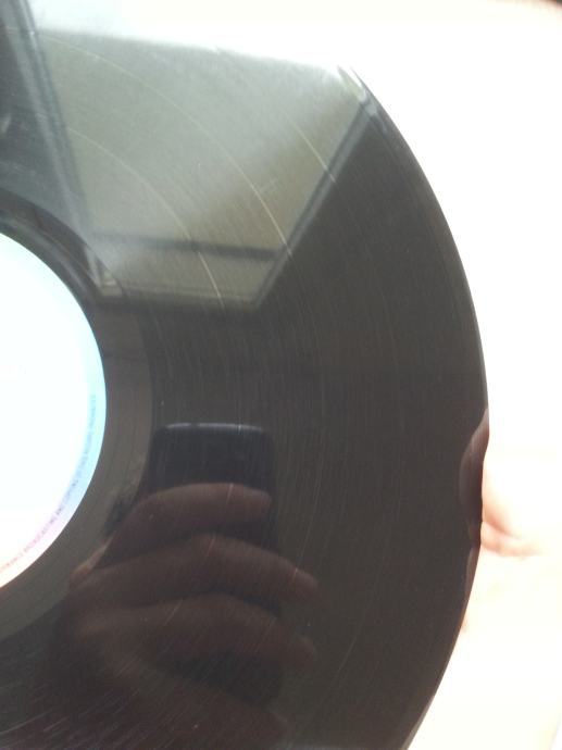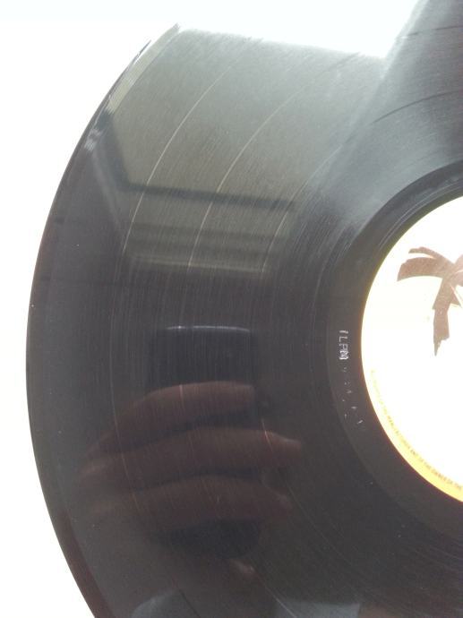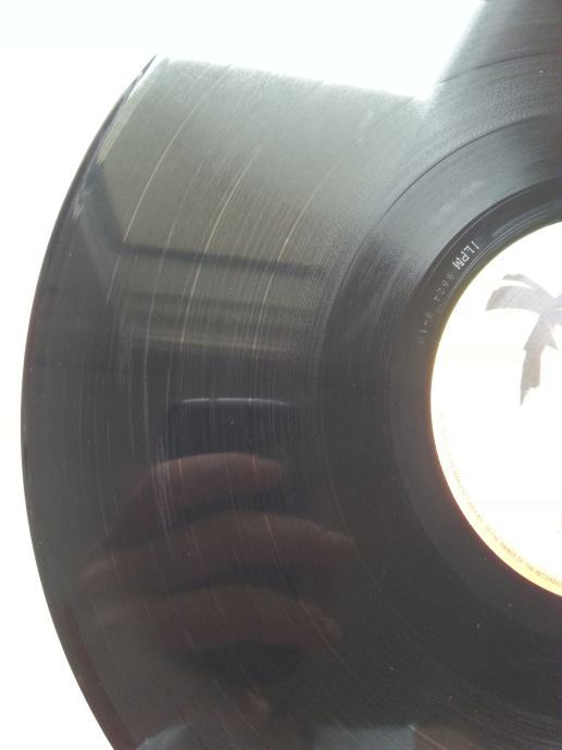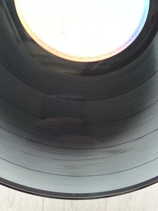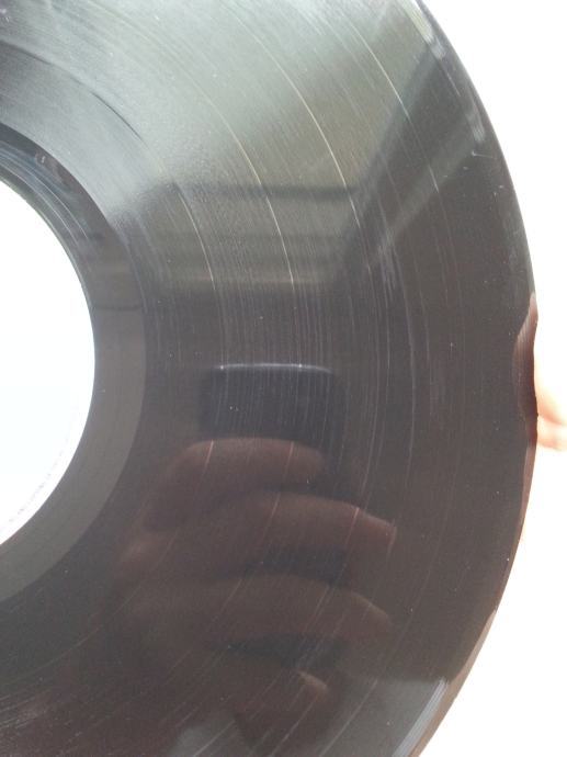 Ploča vizualno: Labeli su jako čisti i uredni, bez ikakvih tragova spindle weara i izgledaju kao novi. Ploča ima sjaj nove i djeluje jako čisto i uredno bez ikakvih dubljih friževa. Tek temeljitim pregledom na jakom svjetlu sam uočio jedan jako sitan površinski frižić na A strani (slika 13) i nešto malo onih najsitnijih crtica nastalih od vađenja iz papirnatog innera koje se u uvjetima normalne osvijetljenosti ni ne vide već samo kao refleksije na direktnom svjetlu. Vizualno ploča izgleda Nm očuvana.
