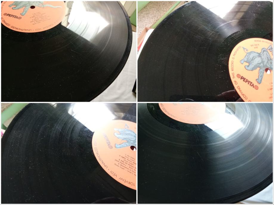 Pogledajte priložene fotografije oglašenog primjerka i YouTube video, koji sadrži iste fotografije veće razlučivosti i autentičnu snimku zvuka s početka prve strane, napravljenu amaterskom opremom. Ploča je u potpunosti slušana neposredno prije oglašavanja, svira bez preskoka igle i stalno daje zvuk otprilike onakav kakav je u spomenutoj snimci, ovisno o kvaliteti opreme kojom se zvuk reproducira. Glede ogrebotina, postoje mnoge, sve su neupadljive, plitke i ne izazivaju glasno pucketanje. Uzdužna oštećenja brazdi nisu upadljiva, uzrokuju pucketanje i jedva primjetnu distorziju zvuka. Rubovi oba omota nisu ni probijeni niti rascijepljeni.