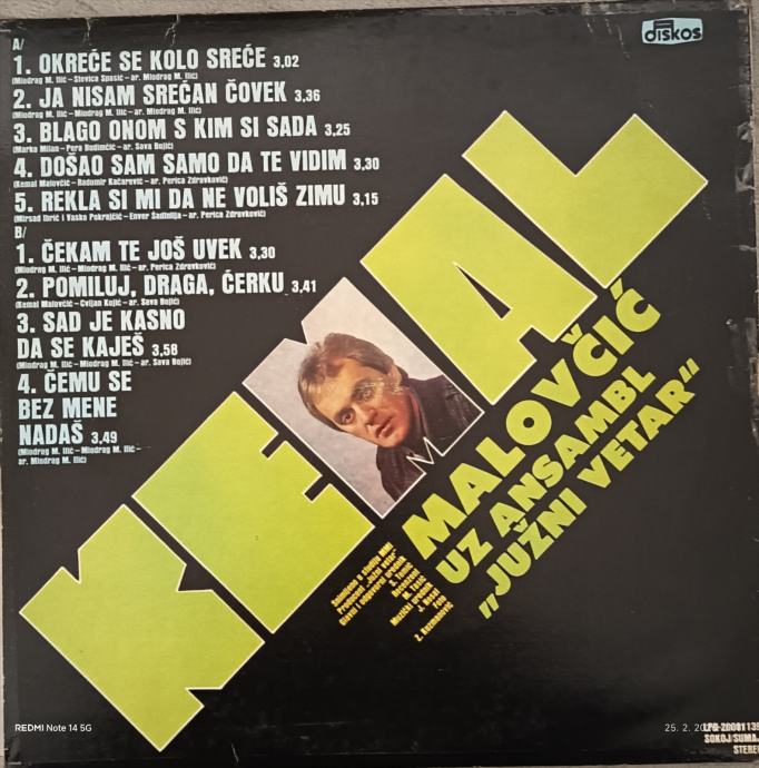 Prodajem gramofonsku ploču Kemala Malovčića uz ansambl "Južni Vetar", izdanu od strane izdavačke kuće Diskos (Made in Yugoslavia).