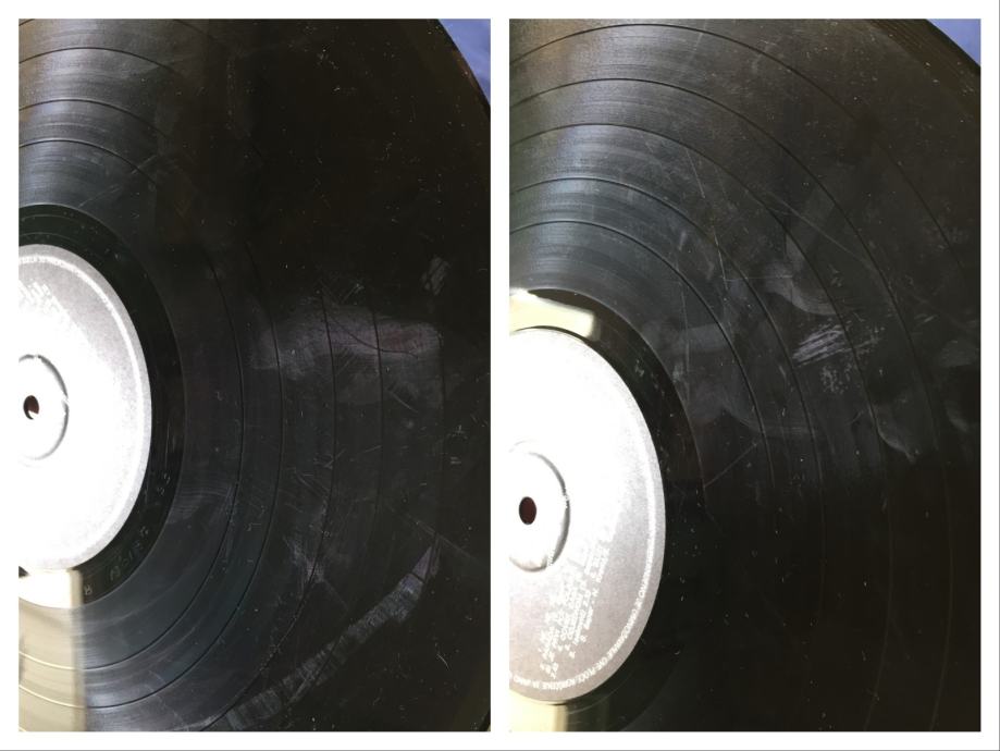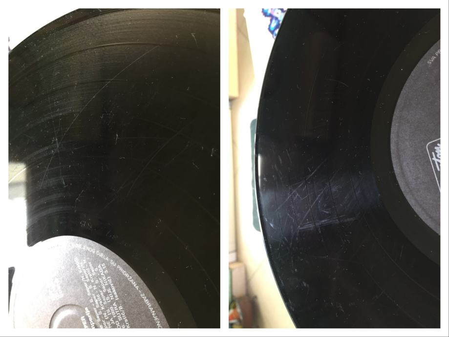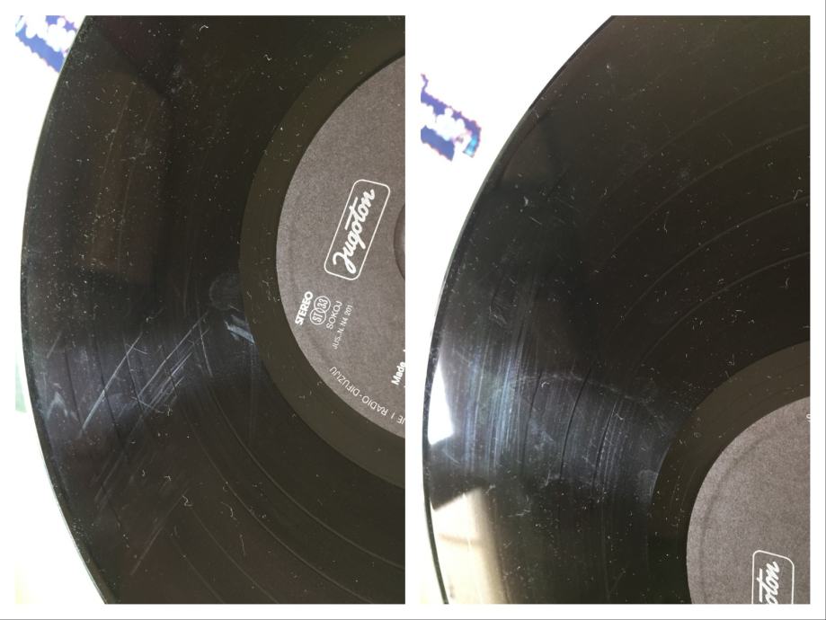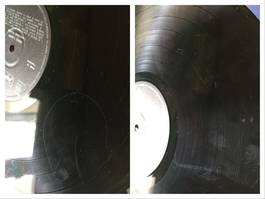 Pogledajte priložene fotografije oglašenog primjerka i YouTube video, koji sadrži iste fotografije veće razlučivosti i autentičnu snimku zvuka s početka prve strane, napravljenu amaterskom opremom. Ploča je u potpunosti slušana neposredno prije oglašavanja, svira bez preskoka igle i stalno daje zvuk otprilike onakav kakav je u spomenutoj snimci, ovisno o kvaliteti opreme kojom se zvuk reproducira. Glede ogrebotina, postoje mnoge, neke su upadljive, ali sve su plitke i ne izazivaju glasno pucketanje. Uzdužna oštećenja brazdi su mjestimično upadljiva, uzrokuju tiho pucketanje i jedva primjetnu distorziju zvuka. Rubovi omota nisu ni probijeni niti rascijepljeni.