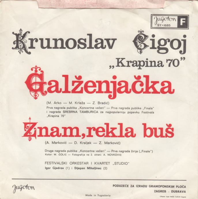 KRUNOSLAV CIGOJ GALŽENJAČKA / ZNAM REKLA BUŠ SINGL GRAMOFONSKA PLOČA