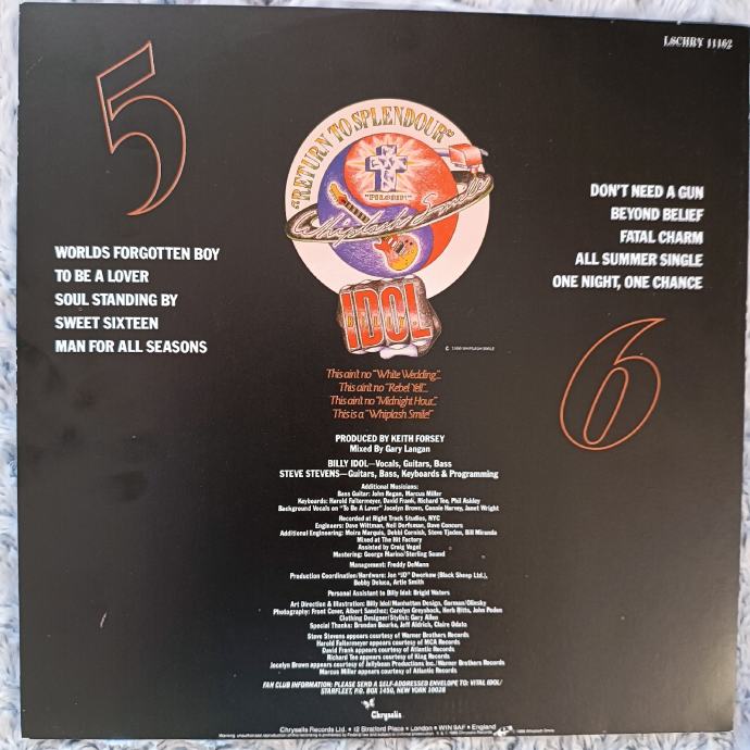 Vinilka Billy Idol-Whiplash Smile, unutranji i vanjski omot u savršenom stanju, Jugoton 1986, ploča bez ogrebotina i otiska, stanje N/M 0958449544
