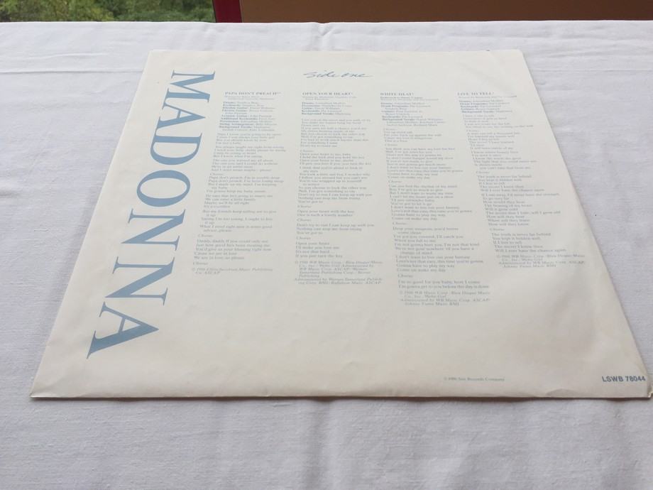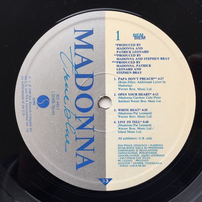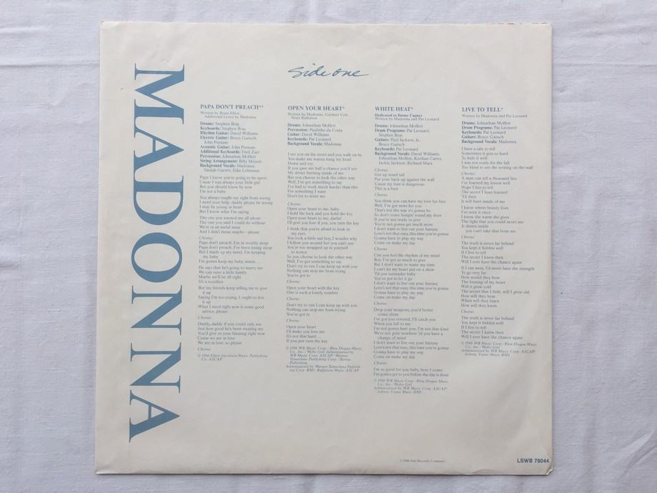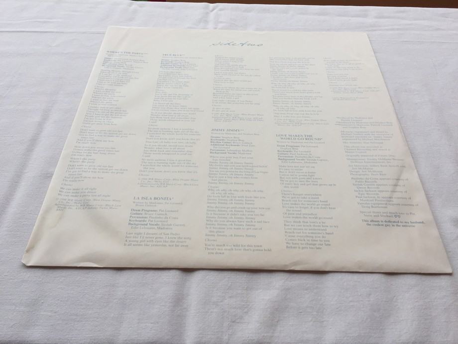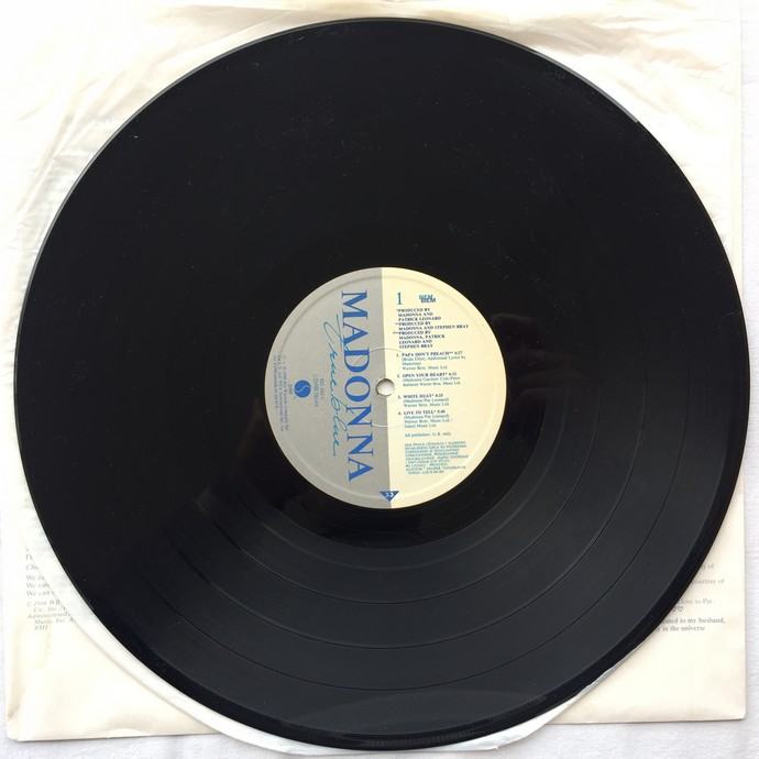 Preskače pri svakom okretu ploče kod pjesme "Papa Don't Preach", zbog uzdužnih oštećenja u brazdama. Ostale pjesme nisam poslušao, poslušati ću ih na zahtjev potencijalnog kupca. Fotografije priložene uz oglas prikazuju ovdje oglašeni predmet.