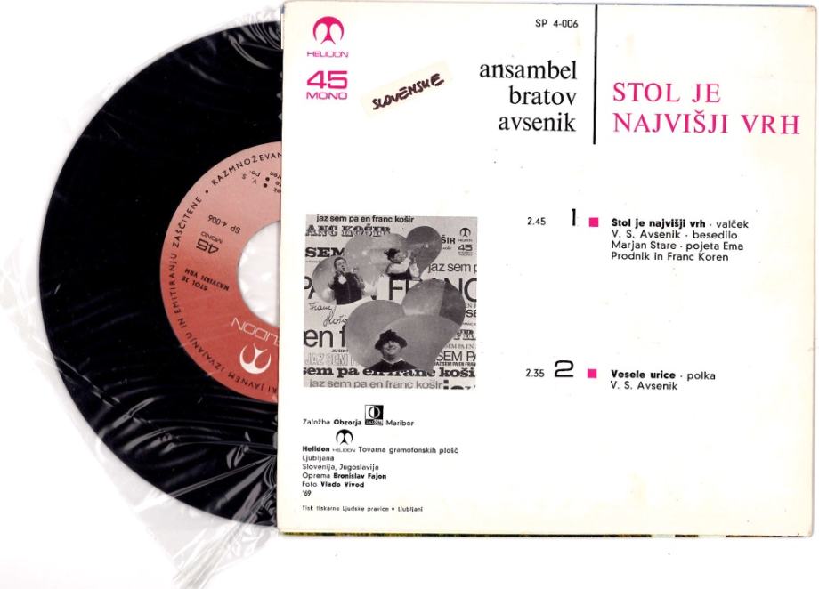 "Ansambel Bratov Avsenik – Stol Je Najvišji Vrh Helidon – SP 4-006 1969 mono"