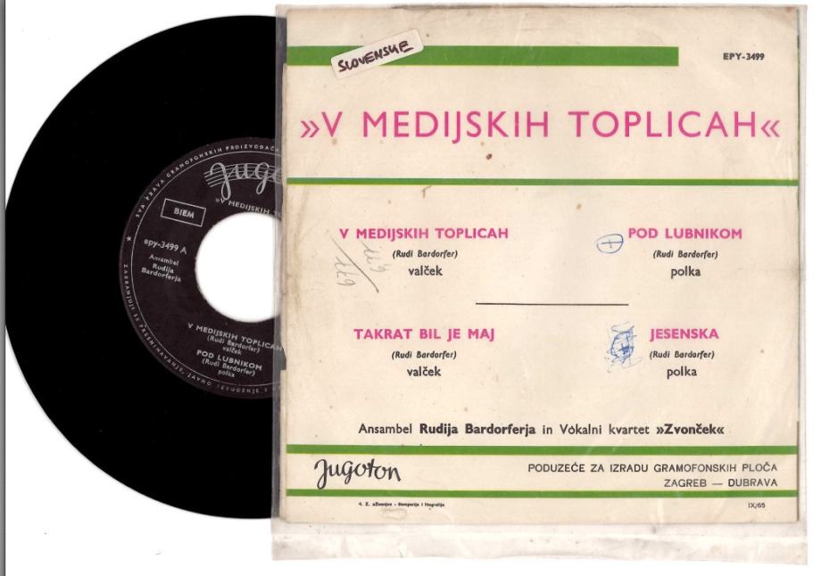 Ansambel Rudija Bardorferja In Vokalni Kvartet "Zvonček"* – V Medijskih Toplicah ,Jugoton – EPY 3499 1965