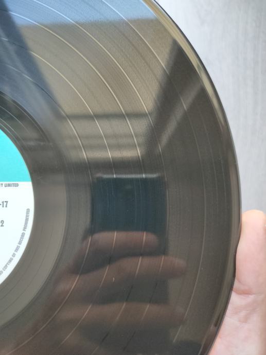Ploča vizualno: Labeli su jako čisti i uredni, bez ikakvih tragova spindle weara i izgledaju kao novi. Ploča ima odličan sjaj i djeluje jako čisto i uredno bez nekih većih friževa koji bi se mogli opipati pod prstom.Tek temeljitim pregledom na direktnom svjetlu sam uočio da ploča ima par sitnih površinskih frižića (slike slike 9 i 15) i više onih najsitnijih crtica koje se u uvjetima normalne osvijetljenosti ni ne vide već samo kao refleksije na direktnom svjetlu. Vizualno ploča izgleda Vg+ očuvana.