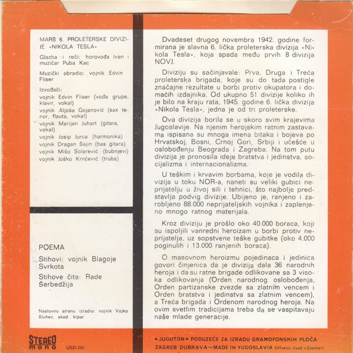 MARŠ 6. PROLETERSKE DIVIZIJE NIKOLA TESLA SINGL GRAMOFONSKA PLOČA