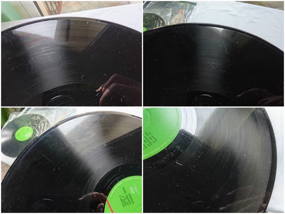 Pogledajte priložene fotografije oglašenog primjerka i YouTube video, koji sadrži iste fotografije veće razlučivosti i autentičnu snimku zvuka na početku prve strane ploče, napravljenu amaterskom opremom. Pločesu u potpunosti slušane neposredno prije oglašavanja, sviraju bez preskoka igle i stalno daju zvuk otprilike onakav kakav je u spomenutoj snimci, ovisno o kvaliteti opreme kojom se zvuk reproducira. Glede ogrebotina, postoje mnoge, neke su upadljive, ali sve su plitke i ne izazivaju značajno pucketanje. Uzdužna oštećenja brazdi su mjestimično vidljiva, nisu upadljiva, uzrokuju vrlo tiho pucketanje i zanemarivu distorziju zvuka. Rubovi omota nisu ni probijeni niti rascijepljeni.