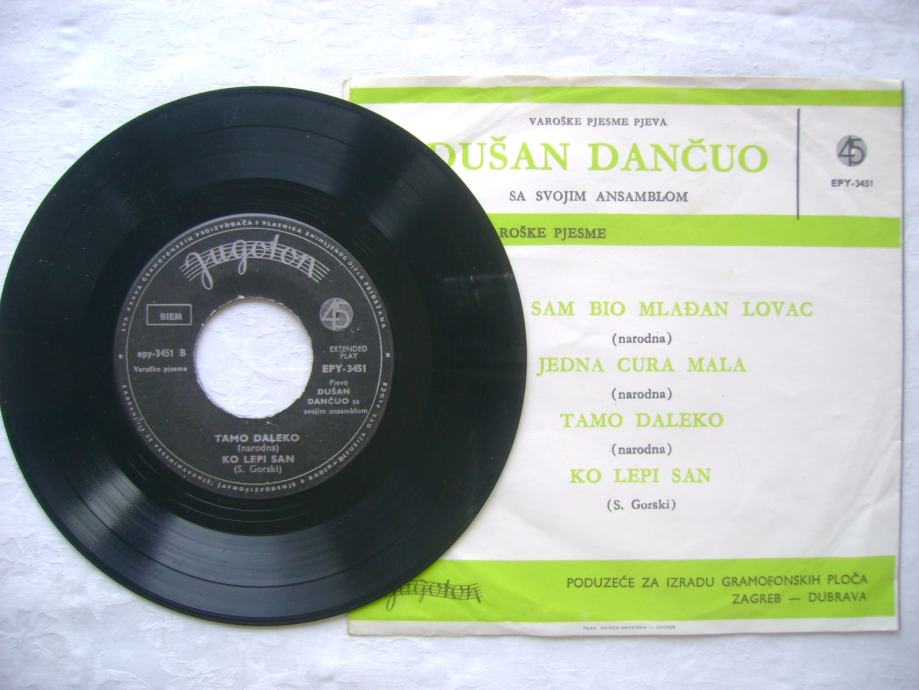 Singl ploča - Dušan Dančuo - Kad sam bio mlađan lovac ja / Jedna cura mala / Tamo daleko / Ko lepi san - nemam gramofon za isprobati, singlica izgleda odlično, ima par površinskih riseva, stanje omota je vidljivo na slikama.