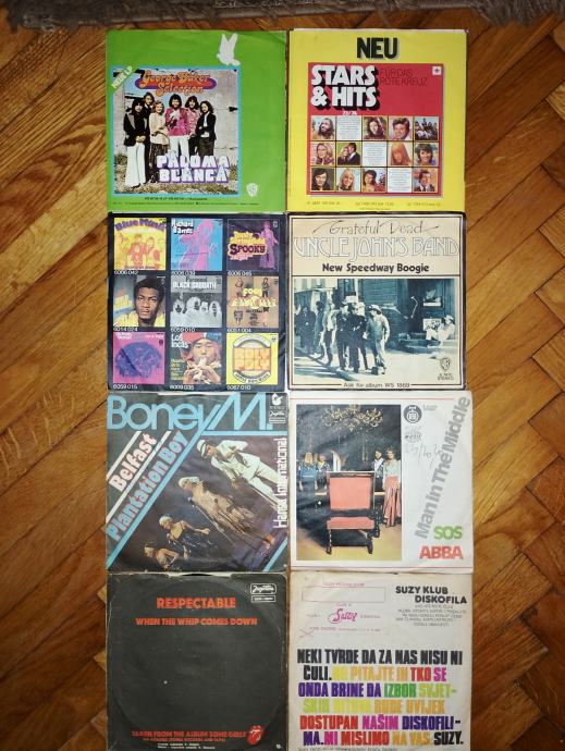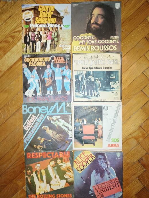 1. Paloma Blanca - original (2 €) ; goodbye my love (2€) ; cucurucucu paloma (2 €) ; grateful dead (1 € - valovita ploča, ali reprodukcija uspješna) ; Boney M - Belfast (2,5 €) ; ABBA - SOS (2,5 €) ; THE ROLLING STONES - respectable (odlična - 3 €) ; Alice Coope - teenage lament ´74. (odlična, 3 €) - svih 8 skupa 12 €