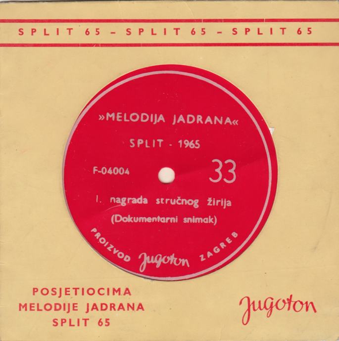 SPLIT 1965 I. NAGRADA STRUČNOG ŽIRIJA DOKUMENARNI SNIMAK FLEXI PLOČA
