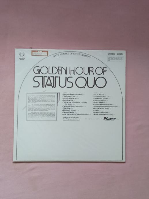 Prodajem LP ploču "Golden Hour of Status Quo" u odličnom stanju. Radi se o kompilacijskom albumu britanskog rock benda Status Quo koji sadrži neke od njihovih najpoznatijih hitova. Ploča ima žutu naljepnicu sa strane. Izvrsna prilika za sve ljubitelje rock glazbe i kolekcionare vinila.