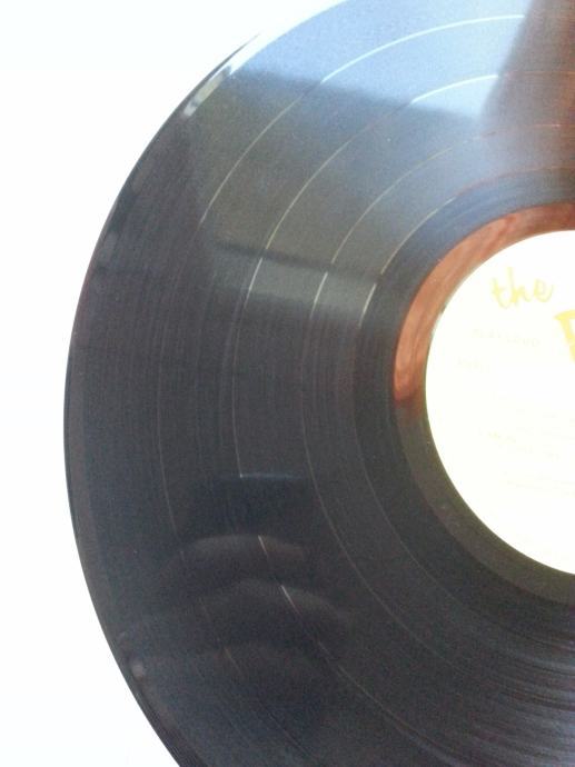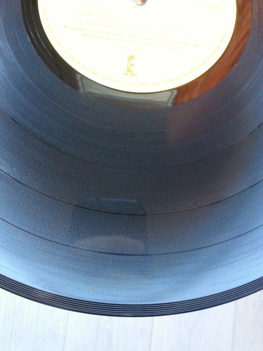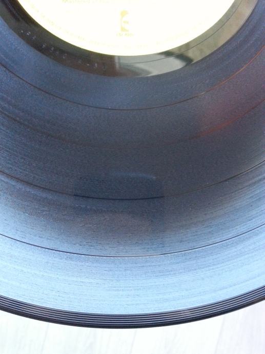 Ploča vizualno: Labeli su jako čisti i uredni, bez ikakvih tragova spindle weara. Ploča ima sjaj nove i djeluje jako čisto i uredno bez ikakvih većih friževa. Tek temeljitim pregledom na jakom svjetlu sam uočio da ploča ima na B strani 1 površinski frižić (slika 15) koji se ne može opipati pod prstom te nisam primjetio da utječe na samu reprodukciju, te nešto onih najsitnijih crtica od vađenja iz papirnatog omota koji se u uvjetima normalne osvijetljenosti ni ne vide već samo kao refleksija na jakom svjetlu. Vizualno ploča izgleda Ex očuvana.