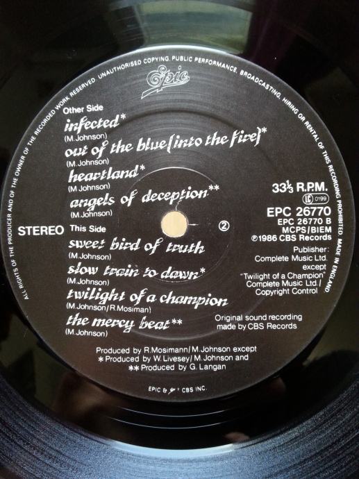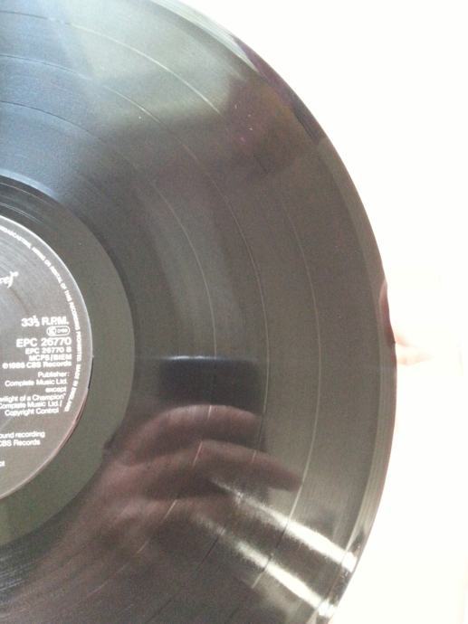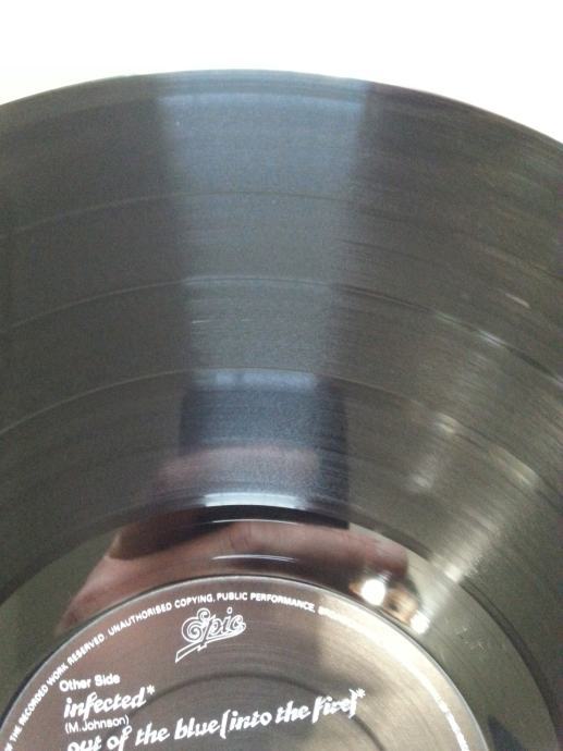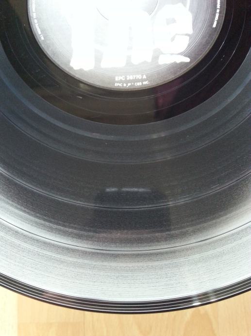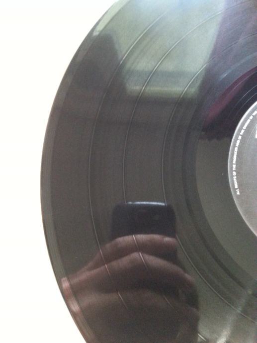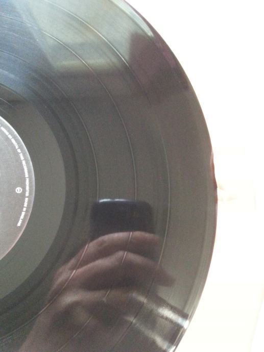 Ploča vizualno: Labeli su jako čisti i uredni, bez ikakvih tragova spindle weara te izgledaju kao novi. Ploča ima sjaj nove i djeluje iznimno čisto i uredno, bez ikakvih većih friževa. Tek temeljitim pregledom na direktnom svjetlu sam uočio jedan jedva vidljiv frižić ala dlaka kose (slika 11) koji se ne može opipati pod prstom te ne utječe na samu reprodukciju. Vizualno ploča izgleda Nm očuvana.