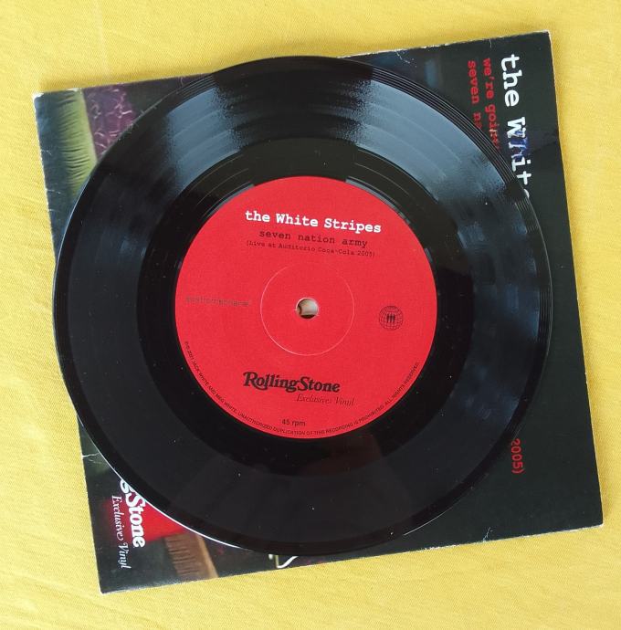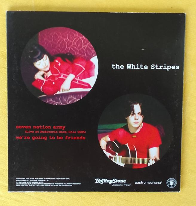 Prodajem rabljenu gramofonsku ploču benda The White Stripes – singl s dvije pjesme snimljene uživo na koncertu u Auditorio Coca-Cola 2005. godine. Ploča sadržava "Seven Nation Army" i "We're Going to Be Friends" u live verzijama. Radi se o ekskluzivnom izdanju Rolling Stone magazina. Na omotu malo ostecenje od naljepnice . Vidljivo na slici .