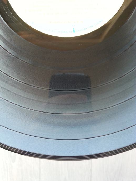 Ploča vizualno: Labeli su jako čisti, uredni i bez ikakvih tragova spindle weara i izgledaju kao novi. Ploča ima fantastičan sjaj i djeluje jako čisto i uredno bez nekih dubljih friževa. Temeljitim pregledom sam uočio par sitnih površinskih frižića na A strani (slike 13 i 14) i nešto malo onih najsitnijih crtica nastalih od vađenja ploče iz kartonskog innera koje se u uvjetima normalne osvijetljenosti ni ne vide već samo kao refleksije na direktnom svjetlu. Vizualno ploča izgleda Vg+ ili Ex očuvana.