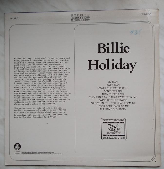 Billie Holiday – Billie Holiday, PGP RTB – 2221543, Everest – 90287-7, Everest Records Archive Of Folk & Jazz Music – FS-265