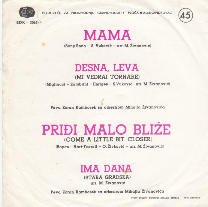 ZORAN RAMBOSEK MAMA (SONNY & CHER) / COME A LITTLE BIT CLOSER SINGL PL