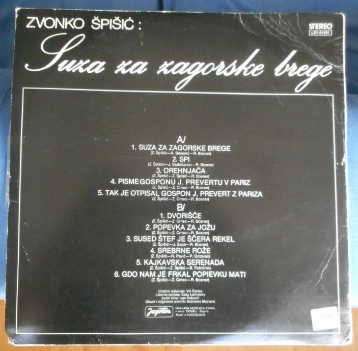 ZVONKO ŠPIŠIĆ SUZA ZA ZAGORSKE BREGE LP GRAMOFONSKA PLOČA