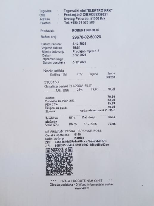 Električna grijalica - panel 2000 w marke Elit, kupljena 05.12.2025. i korištena 12 dana. Dolazi uz račun i jamstveni list.