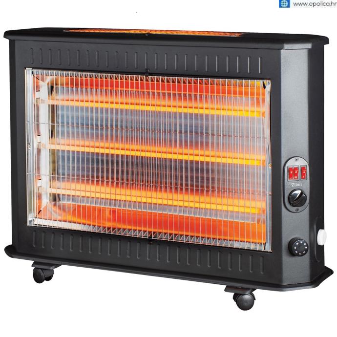 Grijalica sa halogenim ( kvarcnim ) grijačem, snaga 2800 W, 3 razine grijanja, 4 kvarcne cijevi, termostat, mehanički timer, sigurnosni prekidač - zaštita od prevrtranja
