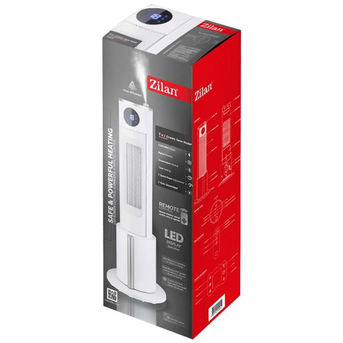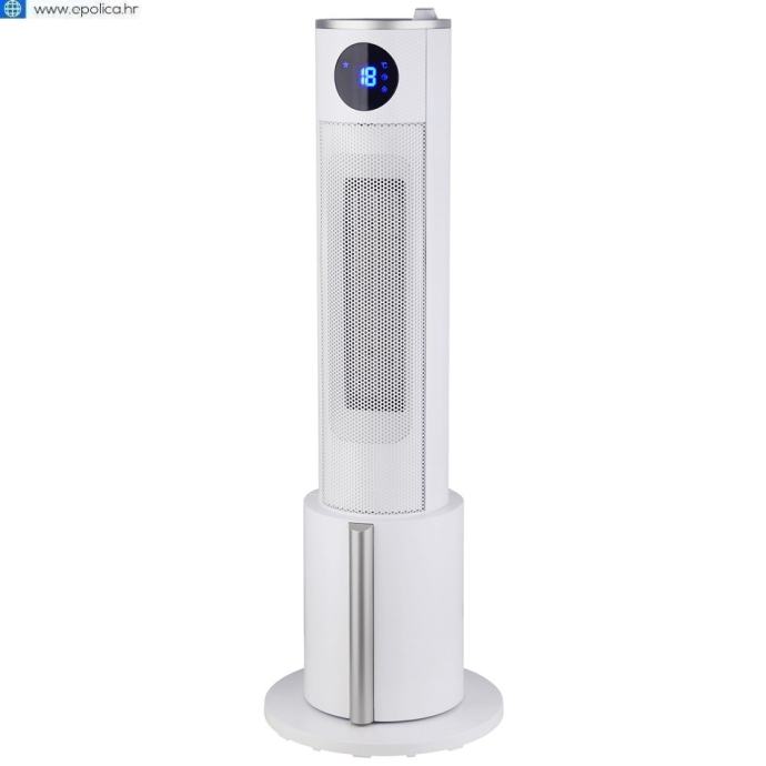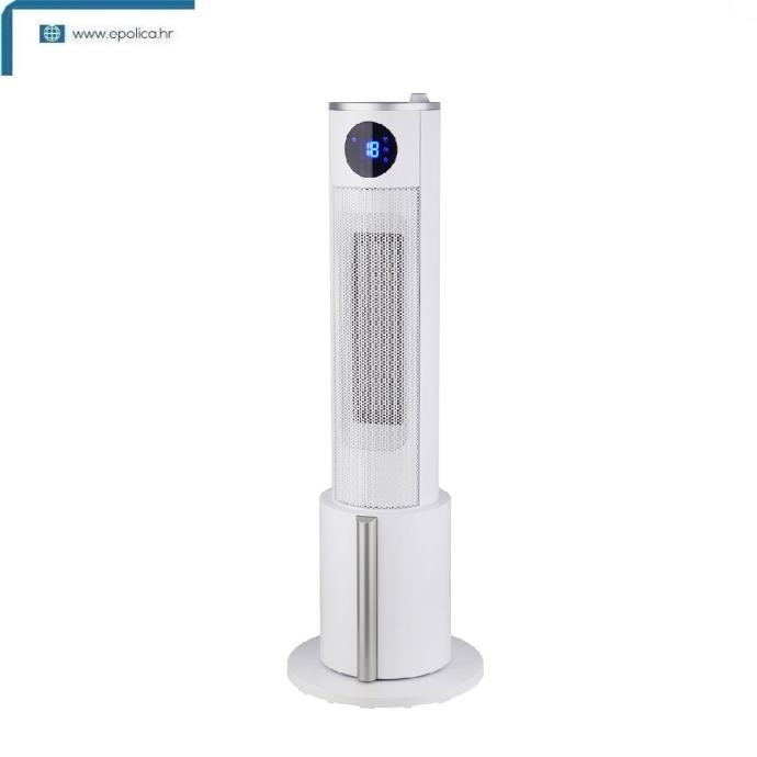 Grijalica sa keramičkim grijačem, 3u1, snaga 2200 W, visokoučinkoviti PTC grijaći element, 3 načina rada FAN / WARM / HOT, 3 postavke grijanja 700W / 1700W / 2200W, podešavanje temperature od 10 do 35°C, širokokutno osciliranje, 12-satni timer, LED zaslon, daljinski upravljač i mekani zaslon osjetljiv na dodir, ovlaživač zraka, zaštita od pregrijavanja, zaštita od prevrtanja.