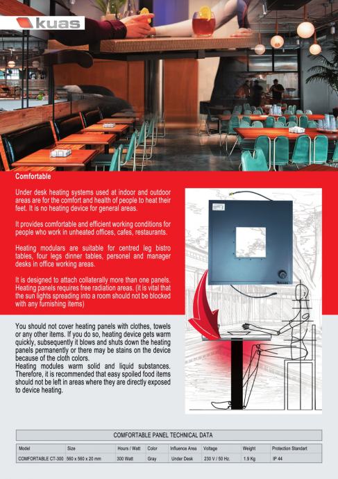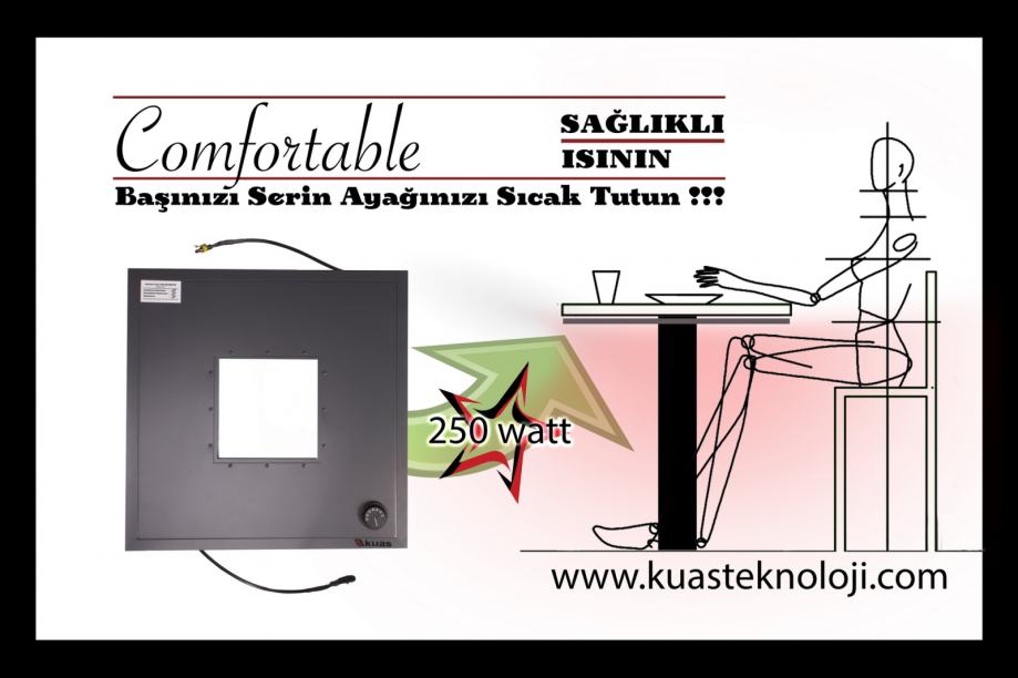 PO ZIMI JE NAJBITNIJE ZAGRIJATI NOGE. INFRACRVENI PANEL ZA NOGE MONTIRA SE ISPOD STOLA, TE IC ZRAKAMA ZAGRIJAVA NOGE. JEDAN IC PANEL DOVOLJAN JE ZA 4 OSOBE, A POTROŠNJA MU JE SAMO 250 WATTA.