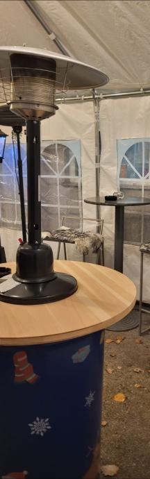Plinske grijalice 2 kom.sa motivima zime i bozica.lako se skidaju.ko nove.top stanje.sa okruglim stolom.1 koristene.plinska boca ide unutar stola.dolazi sa crijevom i regulatorom.boce nisu u cijeni.500 eura komad