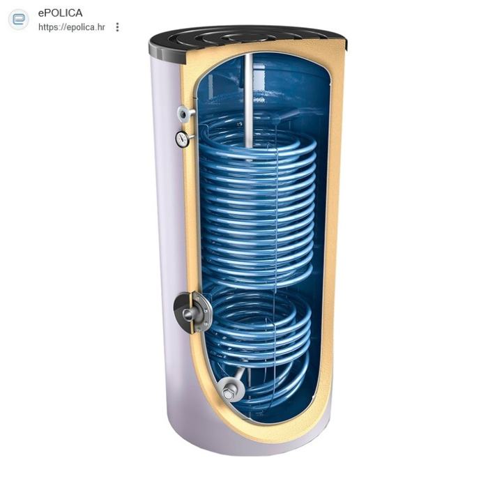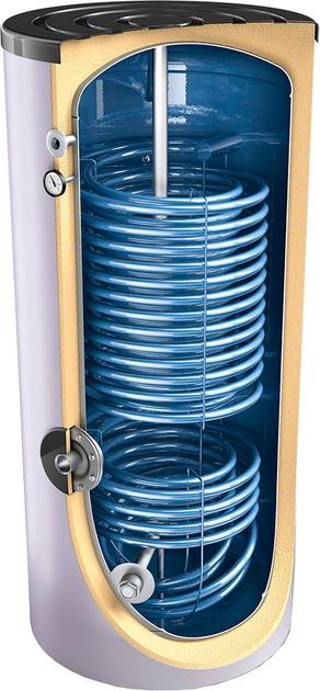 Akumulacijski spremnik Tesy za sustave s dizalicom topline EV 2x5 2x12 S2 300 65 HP s 2 izmjenjivača topline. Dvostruki spiralni izmjenjivač topline dizajniran je za rad s toplinskim pumpama s većim nazivnim izlazom (instalacije na niskoj temperaturi). Drugi dvostruki spiralni izmjenjivač topline dostupan je za dodatni izvor topline (solarni sustav, plinski kotao, kotao na čvrsta goriva).