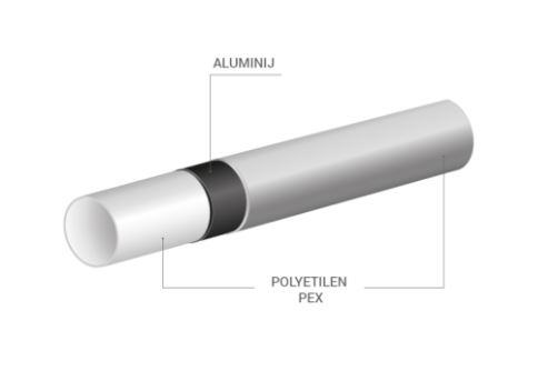3 slojna cijev je pogodan za unutarnje sustave grijanje (topla i hladna voda). Cijev je sastavljena od tri sloja: PEX polietilen, aluminija i