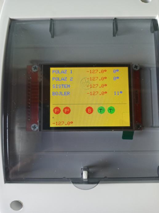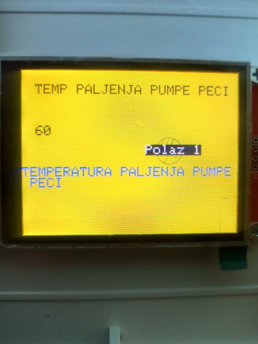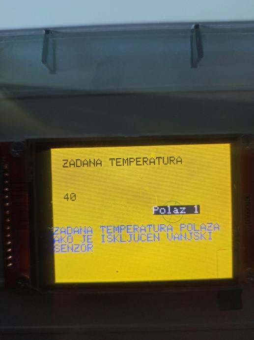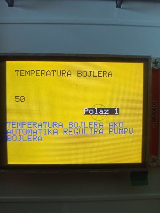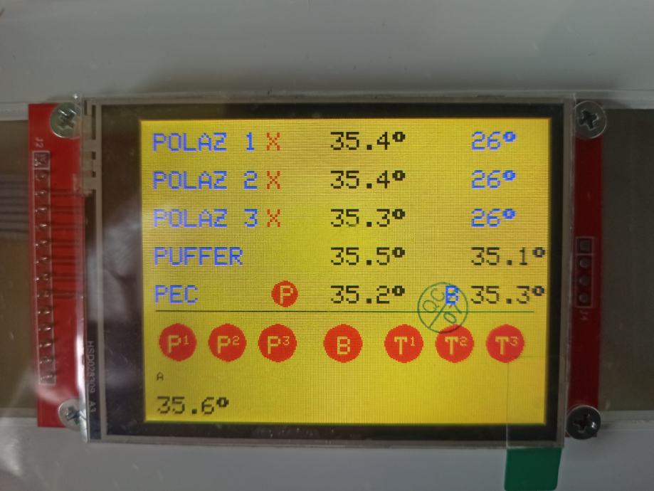 Ekran je dovoljno velik tako da se vidi sve što se događa u radu. Tako vidite kad je pumpa upaljena ili termostat, vidi se i kad se miš ventil okreće i u kojem smijeru, vanjsku temperaturu, temperaturu vode u peći ili pufferu, temperaturu polaza u radijatore i vanjsku temperaturu.