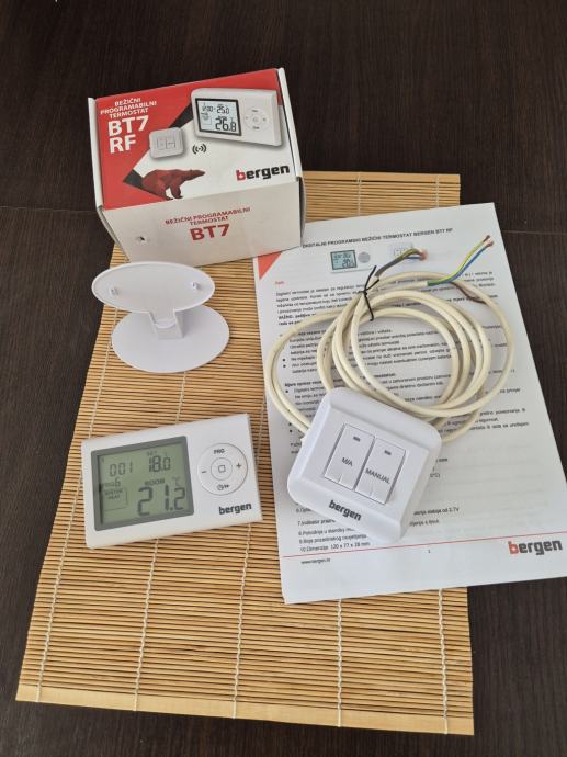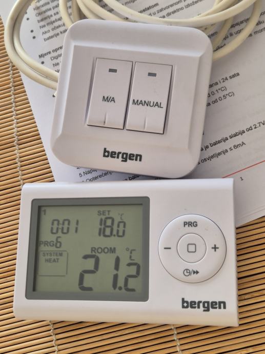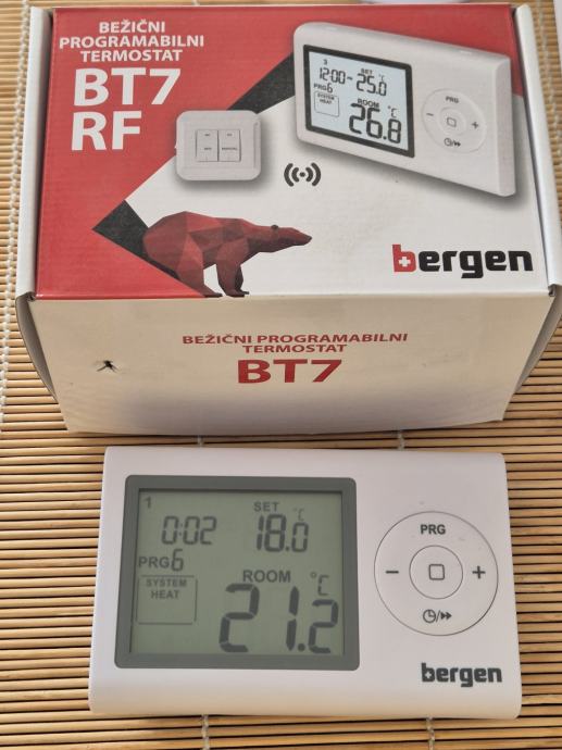 Digitalni sobni termostat BERGEN BT7 namijenjen je gotovo svim uređajima, idealan je za regulaciju temperature bilo koje prostorije i jednostavan je za korištenje. Termostat ima opciju programiranja za vremenski period koji korisnik želi, za maksimalan komfor i uštedu energije. Za zagrijavanje ili hlađenje prostora za svaki dan u tjednu moguće je podesiti temperaturu za šest različitih vremenskih termina uključenja po danu, po slobodnom izboru u desetominutnim koracima, a uz svaki termin uključivanja mogu se podesiti temperature u koracima od 0,5°C. Uređaj je moguće držati u bilo kojoj prostoriji.